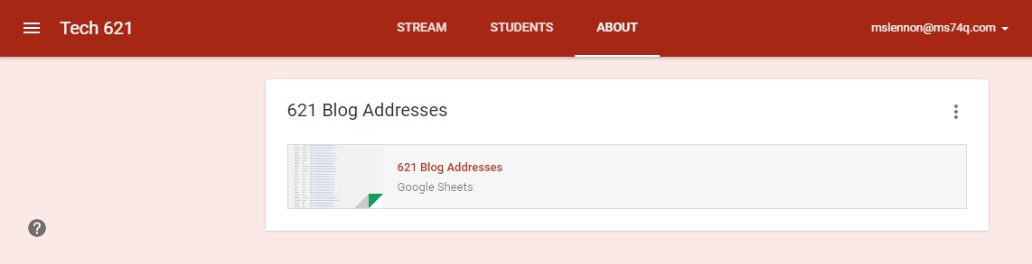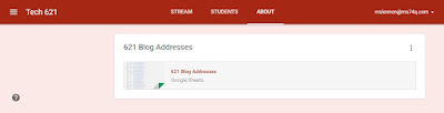 Once they have a Blog address, I paste into a google sheet I've set up in the "About" tab in classroom site. Every student can access this spreadsheet, not just me. (I did lock the sheet, so they don't accidentally delete anyone).