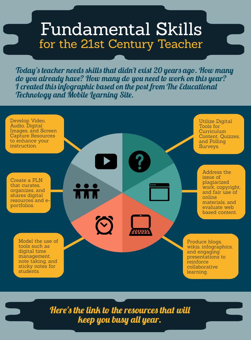 I've got a lot of these skills covered, but certainly not all of them. I'm assuming we all could improve our skills. This post resonated with me, so I made it pretty to post it near my desk. When I glance at it, it reminds me of what I am working towards. For all the resources, go back to the original post in The Educational Technology and Mobile Learning website.